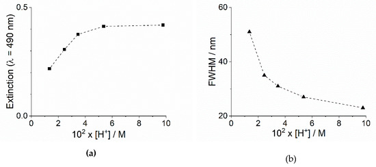 (a) Plot of the extinction values and the relative full width at half maximum, (b) FWHM for the J-band at 490 nm of the final UV/Vis spectra as function of [H+] and fixed ionic strength (IS = 0.6 M).