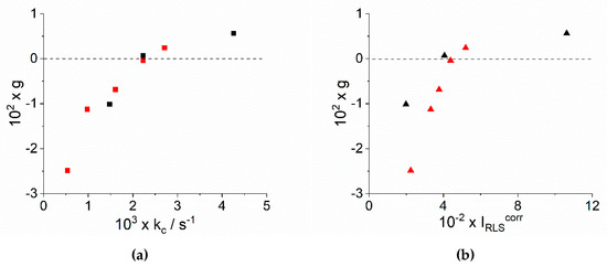 Plot of asymmetry g-factor as function of the corresponding (a) rate constants kc and (b) of the RLS intensity at maxima corrected for the extinction of the samples (black points at fixed ionic strength, red points at fixed pH).