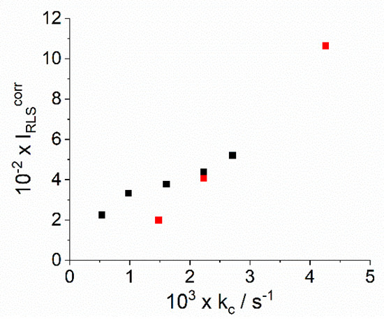 Plot of the RLS intensity at maxima corrected for the extinction of the samples as function of the corresponding rate constants kc (black points at fixed ionic strength, red points at fixed pH).