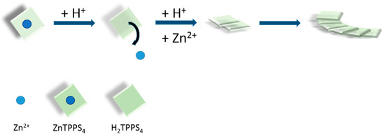 Pictorial sketch of ZnTPPS4 demetallation and subsequent aggregation of the diacid H2TPPS4.