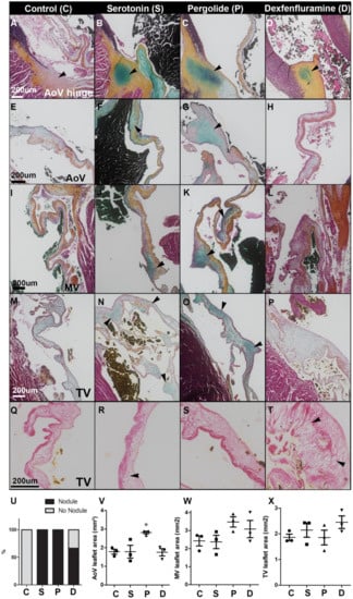 Drug treatments induce distinct valvular lesions: (A–D): Representative Movat’s pentachrome staining performed on heart section from control (A) and serotonin- (B), pergolide- (C), and dexfenfluramine- (D) treated rabbits. Arrowheads indicate chondroid metaplasia. (E–P): Representative Movat’s pentachrome staining performed on aortic valve (AoV) (E-H), mitral valve (MV) (I–L), and tricuspid valve (TV) (M–P) leaflet sections from control (E,I,M), serotonin (F,J,N), pergolide (G,K,O), and dexfenfluramine (H,L,P). Arrowheads indicate GAG-rich deposit. (Q–T): Picrosirius red staining performed on TV leaflet section from control (Q) and serotonin- (R), pergolide- (S), and dexfenfluramine- (T) treated rabbits. Arrowhead indicates remodeled collagen layer. (U): Percentage of hearts displaying chondroid metaplasia at the aortic valve hinge. (V–X): Leaflet area was measured and averaged from at least 4 different sections per valve and rabbit (n = 3). Data are reported as dot plots where each dot represents a rabbit and the horizontal bar indicates the mean ±SEM. * p < 0.05. Kruskal–Wallis test was used to determine statistical significance (n = 3). C = control, S = Serotonin, P = Pergolide, and D = Dexfenfluramine. Scale bars = 200 μm.