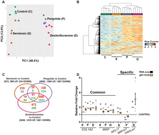 RNA-seq analysis of tricuspid valve (TV) transcriptomes indicate that Pergolide and Dexfenfluramine treatment shares the majority of differentially expressed genes (DEGs). (A): Principal component analysis (PCA) on tricuspid valve leaflets treated with water (green dots, n = 5), serotonin (orange dots, n = 5), pergolide (purple dots, n = 5), and dexfenfluramine (pink dots, n = 5). (B): Heatmap view of z-scored expression profile of DEGs in TV of rabbits treated with serotonin (n = 5), pergolide (n = 5), and dexfenfluramine (n = 5) compared to control (n = 5). (C): Venn diagram displays comparison between DEGs for each drug treatment. (D): Data of qRT-PCR (n = 5 per treatment) are reported as dot plots where each dot represents a rabbit and the horizontal bar indicates the mean ±SEM as compared to relative fold change obtained by RNA-seq analysis. # FDR <0.05, * p < 0.05 determined with one-way ANOVA followed by Dunnett’s multiple comparison test (n = 5 for each treatment). ^ <0.05 determined with Mann–Whitney test.