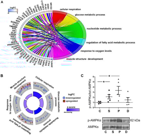 Decreased metabolism and muscle structure are enriched by serotonin, pergolide, and dexfenfluramine treatment. AMPK activation by serotonin and pergolide. (A): Chord plot shows 46 common DEGs and their overlap between significant Gene Ontology (GO) terms. (B): Circular plot is colored according to z-score and highlights logFC of DEGs among significant GO terms. The outer circle shows a scatter plot for each term of the logFC of the assigned genes. Red and blue dots display individual up-regulated and down-regulated genes, respectively. The inner rectangles are sized to positively correlate with the significance of each GO term, and colored to represent the overall direction of change in expression of each individual term. (C): Western blotting detection of phosphorylation of AMPKα and total AMPKα in TV leaflet total protein extracts. Data are reported as dot plots where each dot represents a rabbit and the horizontal bar indicates the mean ±SEM. * p < 0.05, determined with one-way ANOVA followed by Dunnett’s multiple comparison test (n = 5 for each treatment).