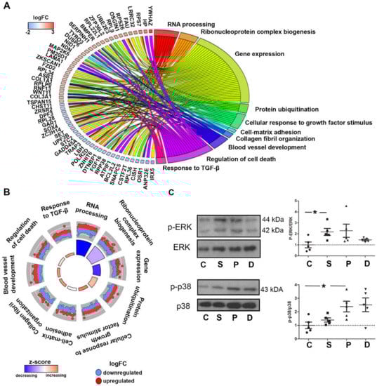 Pergolide and dexfenfluramine treatment promote a decrease in biosynthetic process and an increase of response to growth factor stimulation: (A): Chord plot indicates common DEGs for pergolide and dexfenfluramine with at least a 2-fold change compared to control tricuspid leaflets and related to significant GO terms. (B): Circular plot indicates GO terms that are likely to be decreased or increased by pergolide and dexfenfluramine. (C): Western blotting detection of phosphorylated ERK (p-ERK), total ERK, phosphorylated p38 (p-p38), and total p38 in TV leaflet total protein extracts. Data are reported as dot plots, where each dot represents a rabbit and the horizontal bar indicates the mean ± SEM. * p < 0.05, determined with one-way ANOVA followed by Dunnett’s multiple comparison test (n = 5 for each treatment).