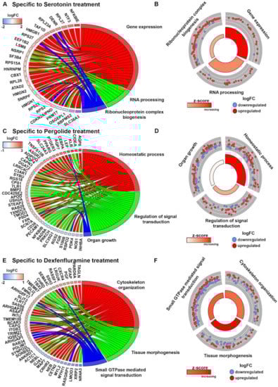 We then searched for biological processes that would distinguish each treatment (Figure 5A–F). It appeared that, in sharp contrast to the two drugs together, serotonin caused an increase of ribonucleoprotein complex biogenesis, gene expression, and RNA processing (Figure 4A,B and Figure 5A,B). In agreement with the strong activation of AMPK-α, pergolide specifically affected genes promoting homeostatic process, and, to a lesser extent, organ growth (Figure 5C,D). Finally, dexfenfluramine treatment increased cytoskeletal organization and tissue morphogenesis (Figure 5E,F), which might corroborate the observed distinct changes induced on valve histology (Figure 1). Altogether, these results indicated that high-dose serotonin, pergolide, and dexfenfluramine cause valve remodeling through distinct molecular pathways and biological processes.