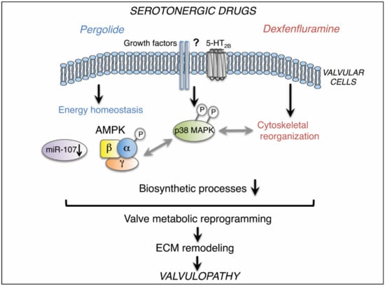 Schematic summary: chronic use of pergolide or dexfenfluramine activates p38 MAPK in valvular cells. Specifically, pergolide triggers AMPK- and miR-107-dependent homeostasis processes, whereas dexfenfluramine affects cytoskeletal organization. Drug-induced alterations of valve homeostasis and cytoskeleton are associated with net inhibition of biosynthetic processes that reflect valve metabolic reprogramming, leading to ECM remodeling and valvulopathy. Gray arrows represent hypothetical links.