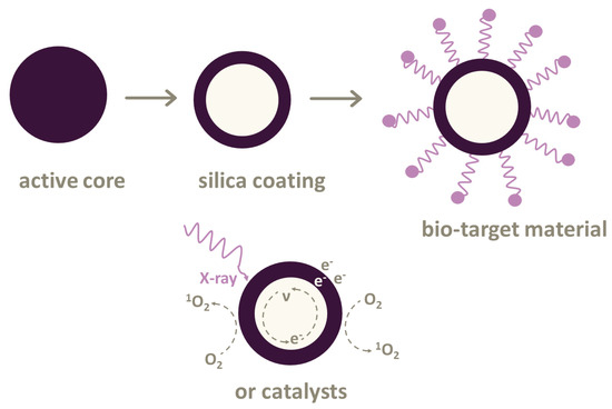 Nanoparticles used in X-ray photodynamic therapy (XPDT) and photodynamic therapy (PDT). The active core of nanoparticles can be coated with silica cover. It is possible to attach linkers or bio-target materials to some nanoparticles or use various types of catalysts.