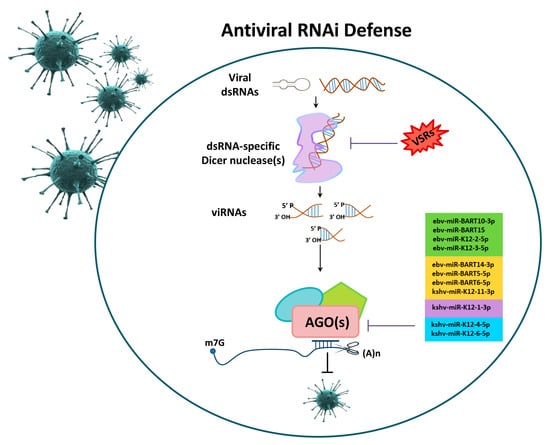 Post-transcriptional gene silencing during viral infections. Viruses that enter into eukaryotic hosts are able to produce their own miRNAs (viral miRNAs), which affects the immune system or aids their latency phase by reducing their expression. Viral double-stranded RNAs are cleaved by the dsRNA-specific Dicer nuclease, which is a discrete family of PRRs, to generate virus-derived small RNAs (viRNAs) and, hence, RNAi-silencing activation. To counterbalance viRNAs production, viruses express intrinsic Viral Suppressors of RNA silencing (VSRs) factors in order to protect themselves from Dicer-mediated cleavage and/or impede viRNAs loading onto AGO proteins. Based on the analysis of published datasets [82,83,84], human Ago-gene expression can be regulated by viRNAs derived from EBV and Kaposi’s Sarcoma-associated Herpes virus (KSHV).