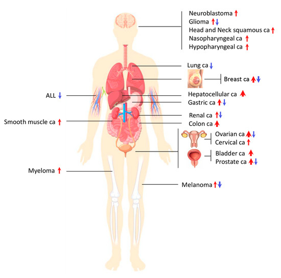 The deregulated AGO-gene expression is observed in a variety of malignancies such as breast cancer, melanoma, ovarian, urothelial, prostate, clear-cell renal, gastric, and colorectal carcinomas, as it seems to affect the proliferation rate and/or migratory potential of tumor cells [126,127,128,129,130,131,132]. Elevated expression of AGO is often reported in glioma, breast, hepatocellular, gastric, colon, ovarian, bladder, and prostate cancers, even though there are incidents of lower levels detected, as graphically illustrated in Figure 3. Expression studies for breast, lung, prostate, gastric, and renal cancers as well as glioma, melanoma, and acute lymphoblastic leukemia support the heterogeneity of AGO-expression levels in cancer. A detailed annotation regarding the changes (increase or decrease) of AGO expression across different cancer types is presented in Table 1. The deregulation of AGO2, which is the most abundant member of the family, has been associated with tumorigenesis and cancer progression and, therefore, it has been suggested for therapeutic intervention and treatment [133,134,135,136]. Using GeneMANIA (Multiple Association Network Integration Algorithm) [137] for prediction of gene function, Liu and colleagues revealed that AGO2 upregulation was correlated with acceleration in tumor progression and poor survival in a cohort of 962 lung-cancer patients [138]. However, in melanoma cells, downregulation of AGO2 is able to confer cell and tumor-growth [139]. Since AGOs exhibit cell-type-dependent and tissue-dependent sub-cellular-distribution patterns, and different regulation profiles of gene expression in between normal and oncogenic cellular settings [140], opposite functionalities are expected to be deployed by following tumor-specific fashions.