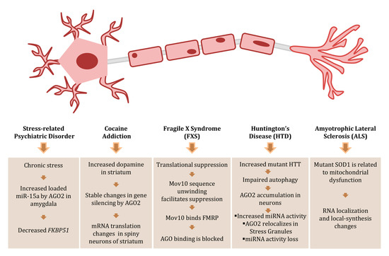 RISC machinery is an important regulator of gene expression in stress-related psychiatric pathologies. Molecular analysis and behavioral studies in mice indicate that AGO2-associated miRNAs and cognate mRNA targets play an important role in these conditions, as the AGO-miRNA complex is a key regulator of intact behavioral response(s) to chronic stress (Figure 4). Chronic stress leads to increased miR-15a levels in the amygdala-AGO2 complex and a simultaneous reduction of its predicted target, FKBP51, whose protein product is involved in stress-related psychiatric disorders [218]. Implication of the RISC machinery was reported in post-traumatic stress disorder (PTSD) of war veterans (WV), validated by the clinician administered PTSD scale (CAPS) [219], and the Diagnostic and Statistical Manual of mental disorder (DSM-V) [220]. In particular, there is deregulation of the miRNA biogenesis pathway due to diminished expression of its key molecules AGO2, DCR1, and STAT3 [221]. Even in the case of cocaine addiction, AGO2 has been significantly involved. In such a situation, elevated levels of released dopamine are followed by stable changes in gene transcription, mRNA translation, and metabolism, within medium spiny neurons in the striatum. A distinct group of miRNAs was identified that could be specifically regulated by AGO2 in the striatum and was suggested to likely play a role in cocaine addiction. Furthermore, AGO2 deficiency in Dopamine 2 Receptor (Drd2)-expressing neurons greatly reduces the motivation to self-administered cocaine in mice [222]. The engagement of AGO2 in mental conditions is reinforced by its critical implication in Fragile X Syndrome (FXS), which is a disease of aberrant protein production and behavioral abnormalities that include autistic-like features [223,224,225,226]. The Fragile X Mental Retardation Protein (FMRP) is required for normal cognition and, as a result, FXS patients are cognitively impaired. AGO2 activity is facilitated or blocked by MOV10, which is an RNA helicase that participates in modulating miRNA targeting [227]. MOV10 binding was shown to be located on accessible region(s) at the beginning of 3′-UTR, ~21 nucleotides residing downstream of the terminating ribosome [228]. MOV10 allows the AGO2 binding to formerly inaccessible miRNA Recognition Elements (MREs), by unwinding of GC-rich secondary structures. When FMRP recognizes and interacts with 3′-UTR, AGO2 binding is blocked, which likely uncovers a competitive association of MOV10 for the same GC-rich sequence [229]. Hence, the MOV10 function as helicase may be prevented by the FMRP ability to stabilize the structure with subsequent impact on AGO2 accessibility to MREs in the brain [229].