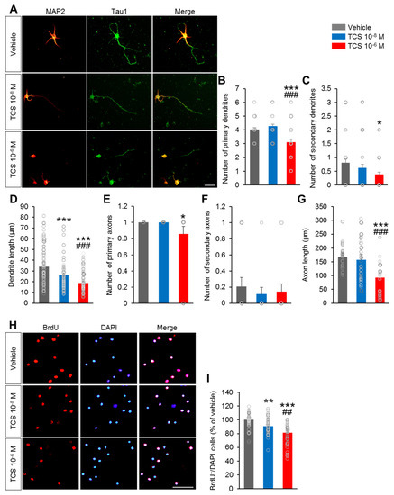 Regarding axon formation, the numbers of primary-, secondary- axons and the length of axons in the TCS 10−8 M group were no significant differences compared to those in the vehicle group (Figure 1E,F). At the TCS high dose (10−6 M), the length of axons in the TCS-treated group was significantly decreased compared to that in the vehicle group (F2,150 = 26.91, p < 0.0001) (Figure 1C).