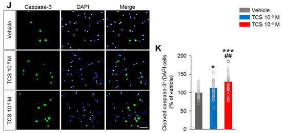 To further elucidate the effects of TCS on neuronal progenitor cells, we assessed the changes in apoptotic cell abundance by using cleaved caspase-3 staining on primary cortical neuron cells. The percentage of caspase-3+/DAPI cell was quantified. As expected, the percentages of caspase-3+ cells were markedly higher in the TCS 10−6 M group compared to the vehicle group (F2,150 = 18.80, p = 0.0005) (Figure 1J,K). Additionally, relative to the vehicle group, there were significantly differences in the percentages of cleaved caspase-3+ cells in the TCS 10−8 M and vehicle groups (Figure 1K). In addition, compared to the TCS 10−8 M treatment group, the percentage of cleaved caspase-3+ cells in the TCS 10−6 M was markedly higher.