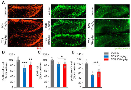 Next, we examined the effect of perinatal exposure to TCS on the proliferation of precursor neuronal cells during embryogenesis. The number of proliferating cells in the dentate gyrus (DG) area of TCS-treated and vehicle embryos by injecting pregnant females with BrdU at E18.5 and harvesting embryos 2 h later (Figure 2A). The number of BrdU+, Ki67+ and p-Histone-H3+ cells in the DG were determined. The number of BrdU+ cells was slightly decreased in the E18.5 TCS-treated groups compared to that of the vehicle group (F2,15 = 20.39, p < 0.0001) (Figure 2A,B). In addition, the number of cells expressing the mitotic marker Ki67+ at DG was significantly lower in TCS-treated groups than in the vehicle group (F2,15 = 6.022, p = 0.0120) (Figure 2A,C). Moreover, the numbers of cells expressing the mitotic marker phospho-histone H3 (p-Histone-H3) at the DG were lower in the TCS-treated groups than in the vehicle group (F2,15 = 23.88, p < 0.0001) (Figure 2A,D). There was no difference in the number of BrdU+, Ki67+ and p-Histone-H3+ cells between the TCS 10 and TCS 100 mg/kg groups (Figure 2A,D).