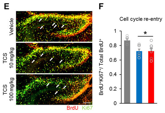 Furthermore, there was a significantly lower proportion of cell cycle re-entry in the TCS-treated groups compared to the vehicle (BrdU+Ki67+/BrdU+) (Figure 2E,F) (F2,15 = 6.485, p = 0.0093). However, TCS 10 mg/kg group showed no significant difference in the proportion of cell cycle re-entry compared to the TCS 100 mg/kg group (Figure 2E,F). These results suggest that TCS can inhibit proliferation and promote apoptosis of neuronal progenitor cells during brain development.