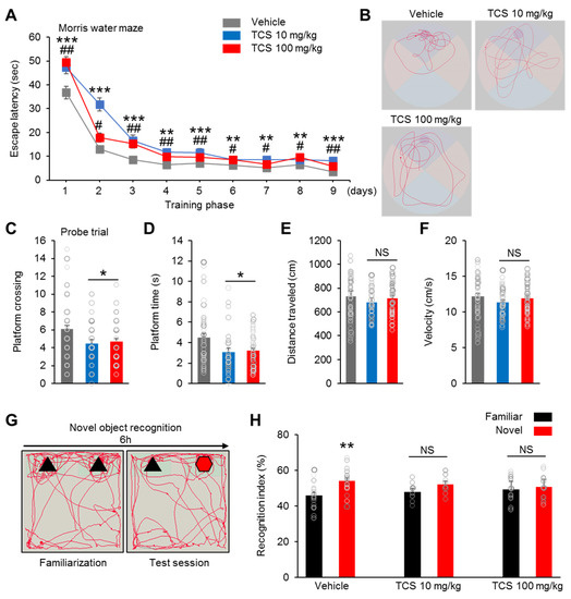 TCS impaired learning and recognition memory in mice. (A) In Morris water maze test, TCS-treated groups exhibit spatial learning disability; n = 18 mice (7 male, 11 female) for vehicle, 11 mice (8 male, 3 female) for TCS 10 mg/kg, 17 mice (10 male, 7 female) for TCS 100 mg/kg. (B) Representative swimming paths of vehicle, TCS 10 mg/kg and TCS 100 mg/kg during a probe trial after training. (C–F) Quantification of B. TCS 10 mg/kg and TCS 100 mg/kg group showed a decrease in platform crossings and time spent in platform. TCS-treated groups showed no change in swimming distances and swimming speeds. * p < 0.05 vehicle vs. TCS 10 mg/kg, ** p < 0.01 vehicle vs. TCS 10 mg/kg, *** p < 0.001 vehicle vs. TCS 10 mg/kg. # p < 0.05 vehicle vs. TCS 100 mg/kg, ## p < 0.01 vehicle vs. TCS 100 mg/kg. NS, no significance. (G) Schematic diagram of the novel object recognition test. (H) Novel object test shows recognitive impairment in TCS-treated groups. n = 18 mice (7 male, 11 female) for vehicle, 9 mice (6 male, 3 female) for TCS 10 mg/kg, 14 mice (8 male, 6 female) for TCS 100 mg/kg. Data represent mean ± SEM. Statistical significance was determined by two-way ANOVA. ** p < 0.01 familiar vs. novel object. NS, no significance. Treatments: corn oil; vehicle, TCS; 10 mg/kg/day, TCS; 100 mg/kg.