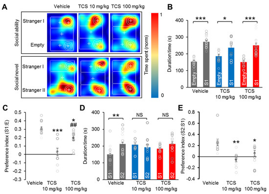 TCS mice display social behavioral alteration in three-chamber tests. (A) Representative heat map images from ‘Stranger I–Empty’ and ‘Stranger I–Stranger II’ from social ability and novel tests. (B,C) Quantification of A for sociability test. TCS-treated groups interact with ‘Stranger’ stimulus mice. Both vehicle and TCS-treated groups display preference for the chamber containing an unfamiliar mouse ‘S1′ than in the empty chamber, but the TCS-treated group preference index was significantly reduced compared to vehicle group. (D,E) Quantification of A for social novelty test. TCS-treated groups showed no preference for a stranger mouse ‘S2′ over a familiar mouse ‘S1′ and lower index of preference for the novel stimulus than in vehicle group. Data represent mean ± SEM. Statistical significance was determined between times exploring empty chamber and stranger I, or times exploring stranger I and stranger II for each group and condition by a two-tailed Student’s t test. For preference index, statistical significance was determined by one-way ANOVA with Bonferroni correction. * p < 0.05 and ** p < 0.01 vs. vehicle, *** p < 0.001 vs. vehicle, ## p < 0.01 TCS 10 mg/kg vs. TCS 100 mg/kg. NS, no significance. n = 18 mice (7 male, 11 female) for vehicle, 11 mice (8 male, 3 female) for TCS 10 mg/kg, 17 mice (10 male, 7 female) for TCS 100 mg/kg. Treatments: corn oil; vehicle, TCS; 10 mg/kg/day, TCS; 100 mg/kg.