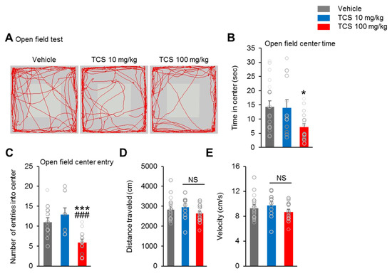 The open-field test was used to analyze motor activity (reflected by the distance traveled) and anxiety-like behavior (reflected by the time spent in the center zone). The TCS 100 mg/kg group spent significantly less time in the open field center zone compared to the vehicle group (F2,43 = 3.962, p = 0.0245) (Figure 5B).