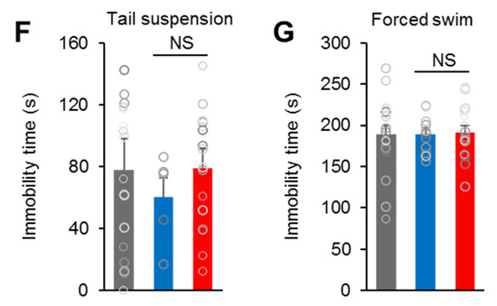 Each mouse was suspended on the edge of a shelf, 50 cm above the surface of a table. The subject mice were allowed to move for 6 min, and behavior was recorded by a camera. Videos were analyzed using EthoVision XT14. The duration of immobility was recorded in the last 5 min.