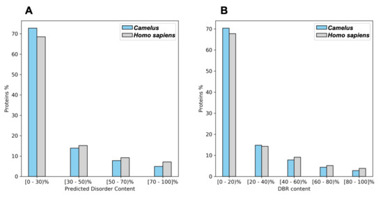We grouped proteins for each genus by disorder content to visualize the impact of highly disordered proteins (having ≥50% disordered residues). As shown in Figure 2A, we found that proteins having 30% or less disordered residues predominated in both genera, at 72.7% for Camelus and 68.5% for Homo sapiens. Meanwhile, even though the absolute amount of disordered amino acids represents more than a third of the whole proteome in both genera (Table 1), extremely disordered proteins (having ≥70% disordered residues) represent only 4.9% and 7.1% of the proteome in Camelus and Homo sapiens, respectively.