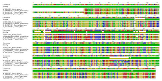 The multiple sequence alignment between the four proteins from Homo sapiens and the three organisms of the genus Camelus (Camelus dromedarius, Camelus bactrianus, and Camelus ferus) with accession numbers (NP_005339, A0A0A0PAR2, XP_010967090 and XP_032338556) was performed using Geneious Prime software v11.0.6 [29].