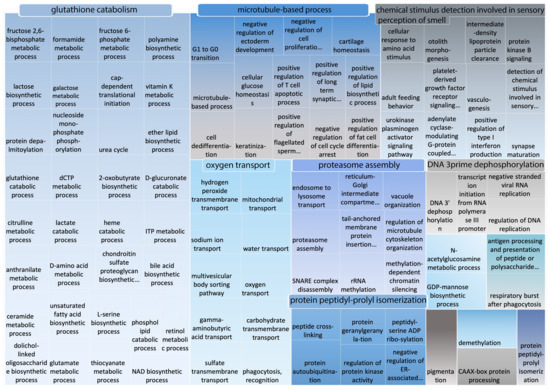 The set of enriched GO terms returned by each analysis available in (Table S2) was used as input for the REVIGO tool [33], which takes long lists of GO terms and clusters them based on semantic similarity in order to remove functional redundancies. The server outputs a reduced set of representative terms that are easier to visualize and interpret (Figure 5 and Figure 6). The set of non-redundant GO terms was depicted as a treemap, which consists of representative umbrella terms (headings in rounded rectangles) that contain several superclusters. Cluster representatives are given a broader name that symbolizes a general function common to all included superclusters, and each supercluster represents a generic function common to all integrated GO classes.