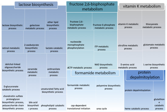 To gain deeper insight into the largest category “glutathione catabolism” (Figure 6), we passed the terms under this category into REVIGO for clustering into more meaningful sub-groups. Surprisingly, the category “lactose biosynthesis”, which was significantly enriched in Camelus disordered proteins, appeared again in this analysis as being noticeably more enriched in the Camelus proteome than in that of Homo sapiens (Figure 7).
