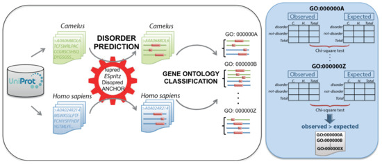 Schematic representation of the methodology used for the comparative study of disordered proteins in Camelus (green) and Homo sapiens (blue). For each organism, protein sequences were retrieved from Uniprot. For each protein, disordered regions (pink) were predicted using three different methods (Iupred, ESpritz, and DISOPRED), and disordered binding regions (DBRs) were predicted using ANCHOR. Disordered proteins were then assigned to GO:BP functional classes using PANZZER, and a comparative analysis of disorder levels between the two genera was performed for each class. Contingency tables were constructed with the per-genus counts of disordered and not-disordered proteins and a Chi-squared test applied. GO classes for which the difference in disorder was positive for Camelus were considered to be more disordered in Camelus than in Homo sapiens.