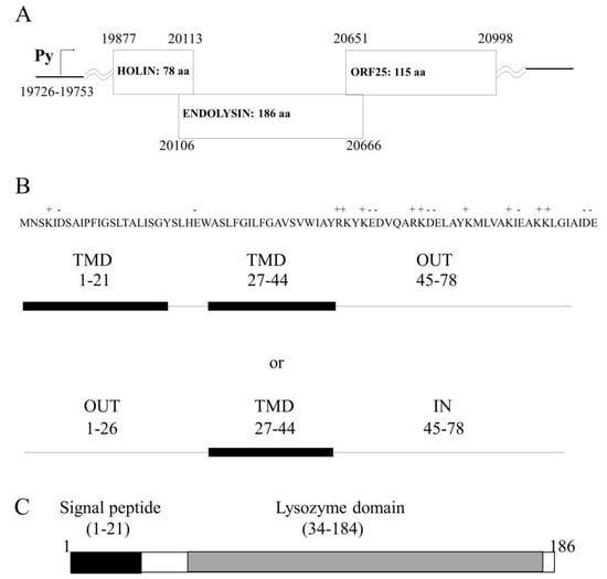 In silico analysis of HP1 phage lytic locus and protein proprieties. (A) Organization of lysis locus within the genome of HP1 phage. Numbers indicate positions within the genome. (B) Amino acid sequence showing charged amino acids of holin protein. Two potential organizations of holin within the cell membrane according to SOSUI (2 trans membrane domains-TMD) and other algorithms (1TMD). (C) HP1 phage endolysin domain organization.