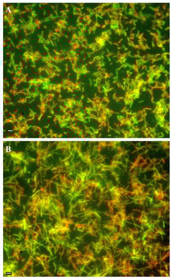 Bacteriophage lytic cycle was induced with mitomycin C for 2.5 h (Figure 3) in wt HP1 or HP1Δhol-lysogenized H. influenzae. At this time, the difference in OD600 between wt HP1 and HP1Δhol-lysogenized H. influenzae strains is 0.2 (Figure 3). Cell viability was assessed using the LIVE/DEAD bacterial viability kit and the same number of cells was taken for the staining. As shown in Figure 5A, in case of cells with induced wt HP1 replication, the number of dead red-stained cells was lower to this of alive green-stained cells (ratio ~0.8:1) as estimated by ImageJ [27]. In case of cells with induced HP1Δhol phage replication cycle, cells were almost twice more elongated than induced H. influenzae cells lysogenized by wt HP1 phage and despite the same number of cells taken for staining, this culture seemed more dense. HP1Δhol phage-containing bacterial cells were not uniformly stained: at the edge of viable bacteria a point with accumulated green stain was observed. In case of HP1Δhol induction, the estimated ratio between dead and alive cells seems to be lower (~0.46:1) than in case of wt HP1 phage, indicating that less cells died in case of replication of HP1Δhol phage than in case of wt HP1.