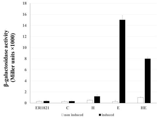 The damage of the cytoplasmic membrane by lytic proteins was described to be sufficient to allow the leakage of cytoplasmic content, including large proteins like β-galactosidase [28]. The ability of HP1 lytic proteins, encoded by genes hol and lys, in induction of lesion in host bacterial envelope was investigated by leakage of β-galactosidase from E. coli cells (Figure 6). For this, three constructs designated as H (pMPMT4::hol), E (pMPMT4::lys), and HE (pMPMT4::hollys), respectively were introduced to E. coli ER1821 cells, naturally expressing β-galactosidase. As control (C), E. coli ER1821 carrying empty pMPMT4Ω vector were used, as well as cells without any vector.