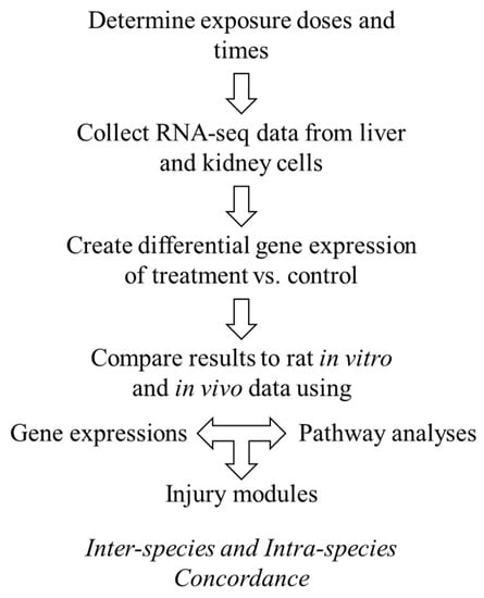 One way to try to bridge the gap between in vivo and in vitro results is to analyze the genomic response induced by a toxicant, i.e., toxicogenomics. In the field of toxicogenomics, a common assumption is that toxicity is associated with a change in the expression of either a single gene or a set of genes (i.e., a gene module) [13,14,15,16], and that chemical exposures leading to the same injury endpoint cause similar changes in gene expression.