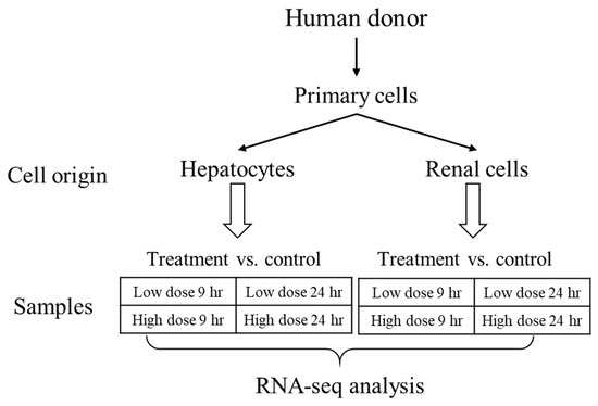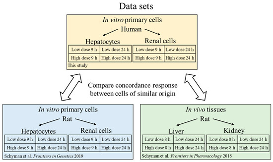 Here, we sought to explore the interspecies correlation using gene-expression responses in human cells exposed to thioacetamide-S-oxide in vitro with those induced by thioacetamide-S-oxide in cultured rat cells (in vitro) and by treating rats with thioacetamide (in vivo), following the diagram in Figure 1. We chose thioacetamide as a model compound since it is known to cause liver diseases (fibrosis, cirrhosis, and carcinoma) in humans and is frequently used to study fibrosis/cirrhosis in animals [26,27,28]. We used our injury modular approach to investigate interspecies correlations and compared it to gene-level and gene-pathway analyses. We found that the activation of our injury modules correlated well between humans and rats and between in vivo and in vitro studies, which was not the case at the individual gene or pathway level. To compare liver- and kidney-specific responses in vitro, we used two cell types from humans and rats—primary hepatocytes and renal tubule epithelial cells—and treated them with vehicle (control), a low dose of thioacetamide-S-oxide, or a high dose of the same compound.