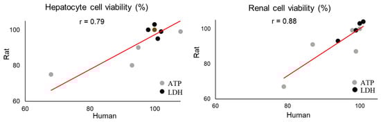 Pearson’s correlation (r) between rat and human adenosine triphosphate (ATP) and lactate dehydrogenase (LDH) in hepatocytes and renal cells after thioacetamide-S-oxide exposure in vitro.