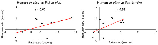 Table 4 summarizes the correlations between the injury modules activated by exposing the liver or kidney to thioacetamide in rats or primary rat and human cells to thioacetamide-S-oxide, when comparing the human in vitro (human IVT) results with the rat in vitro (rat IVT) and in vivo (rat IVV) results (See Supplementary Material for all 24 graphs and tables). The highest correlations, 0.78 and 0.81, were between the in vitro and in vivo data (IVT-IVV) derived from rat cells and tissues collected 24 h after high- and low-dose exposure, respectively. Apart from two other exposure conditions, there was no significant positive correlation for any other dose-time cell-organ condition. The two exceptions involved activation of liver-injury modules 24 h after high-dose treatment, where Pearson’s correlation (r) between the liver-injury modules activated in human cells in vitro and those activated in either rat tissues in vivo or rat cells in vitro was at least 0.6 (Figure 4).