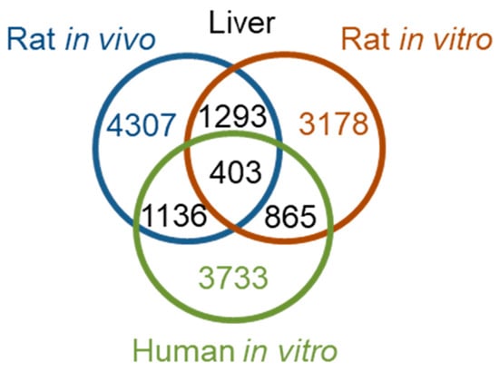 We examined the DEGs in the liver 24 h after high-dose treatment, where we observed interspecies correlations (Table 3). Notably, 24 h after thioacetamide/thioacetamide-S-oxide treatment, the numbers of DEGs in human primary hepatocytes, rat hepatocytes in vivo, and rat primary hepatocytes were comparable, amounting to 3733 (the number of rat genes orthologous to the 4267 human DEGs, identified using the Ensemble website [33]), 4307, and 3178, respectively. Figure 5 shows a Venn diagram of the interspecies overlap of DEGs. There were 403 DEGs common to all three datasets—about 10% of the total DEGs identified in human primary hepatocytes, rat liver in vivo, and rat primary hepatocytes. Although the pair-wise overlaps were roughly 2 to 3 times higher, many DEGs were not shared between species or between in vitro and in vivo studies. In fact, the numbers of overlapping genes were close to the numbers expected to overlap by chance and would result in poor interspecies correlation. To analyze the KEGG pathways in which the 403 overlapping DEGs are involved, we used the David Gene Functional Classification Tool [34,35]. Table 5 shows the 10 most enriched KEGG pathways. The most significantly enriched pathway was the complement and coagulation cascade pathway, which plays an important role in fibrosis. However, it is frequently involved in immune responses, and is therefore not injury specific. Therefore, any mechanistic interpretation across species based on KEGG pathways would be difficult.