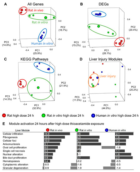 (A) Principal component analysis (PCA) using gene expression changes in liver samples obtained under four different conditions: low-dose 9-h (8 h for rat in vivo), high-dose 9-h (8 h for rat in vivo), low-dose 24-h, and high-dose 24-h treatment. The three enlarged spheres indicate the high-dose 24-h treatment for the three systems, and the ellipses highlight the clustering of conditions within each system. (B) PCA using 403 overlapping DEGs from Figure 2. (C) PCA using KEGG pathway activation for different conditions. (D) PCA using injury-module activation for different conditions. The orange ellipse highlights conditions where the modules indicate liver injury. (E) Graph showing relative liver-injury module activation for each system 24 h after high-dose treatment, ranked by the rat in vivo results.