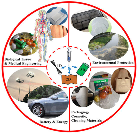 Materials made from electrospinning technology (EST) have been created for use in a variety of applications in several fields due to their small diameter, large specific surface, and high porosity [1,2,3,4,5]. For instance, nanofibers created from electrospinning technology can be used for biological engineering, pollution treatment, and as sustainable energy materials [6,7,8,9,10,11,12,13]. Electrospinning technology refers to a method in which a polymer solution or a melt is spray-stretched and then volatilized or melt-cured in order to create an ultrafine fiber using a high-voltage electrostatic force. Since Rayleigh et al. discovered the technique of electrospinning that results from a liquid jet under electrostatic forces one hundred years ago, the technique has continuously attracted much attention, such as in the preparation of nontissue membranes, acrylic fibers, and various nanofibers [14,15,16]. Biologically, electrospinning has been used for wound dressings and for sustained-release drug materials to maintain a stable release of drugs and avoid the harmful effects of overdosing [17,18,19,20,21,22,23,24,25,26]. Simultaneously, electrospun materials have also been applied to the field of tissue engineering to replace damaged tissue and repair the function of native tissue, including soft bone, vascular, and nerve tissues [27,28,29,30,31,32]. Meanwhile, the rapid development of nanotechnology has also provided new sustainable applications for electrospun materials [33,34,35,36,37,38,39,40,41]. For example, electrospun nanomaterials could be used to adsorb pollutants in air and water due to their large specific surface area and high porosity [42]. Therefore, the electrospinning technique could supply a new strategy for producing ecofriendly nanomaterials with special properties (Figure 1).