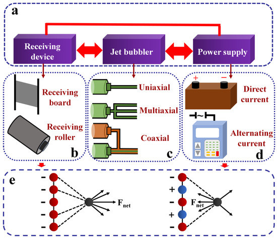 An electrospinning device is mainly composed of three parts: receiving device, jet bubbler, and power supply (Figure 2a). Different types of sustainable materials can be produced by changing the components of the electrospinning equipment. For example, some fibers can be spun onto a plate, while others could be spun under a rotating drum (Figure 2b). Moreover, single-strand fiber can be spun with a single-axis needle, while multiaxis needles can be used to spin multicomponent fibers at the same time, and multilayer wrapped fiber can be spun with coaxial spinning (Figure 2c). Both alternating current (AC) and direct current (DC) can be applied from the electrical power supply of the electrospinning setup (Figure 2d). The electrostatic mechanism that drives electrospinning in DC and AC electrospinning setups is illustrated in Figure 2e.