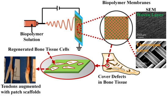 Blended electrospun biopolymer materials can be used to cover the damaged bone tissue and to promote the growth of bone cells [107]. Reproduced from [107]; Open access copyright (2020) Springer Nature.