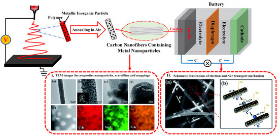 Polymer solutions can be mixed with inorganic metal nanoparticles and electrospun into ecofriendly composite nanofibers as an anode material in a battery after an annealing process. Reproduced with permission from [140]; copyright (2017) Royal Society of Chemistry.