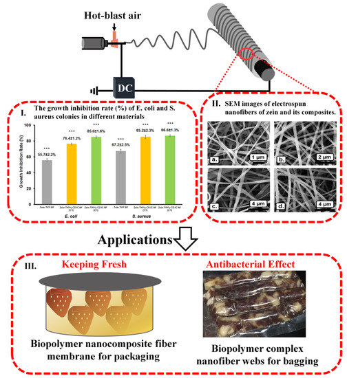 Biopolymer composite nanofibers obtained by electrospinning are used as ecofriendly packaging materials for fruits and meat, providing antibacterial properties and keeping food fresh [87]. Reproduced with permission from [87]; copyright (2017) Elsevier Ltd.