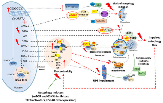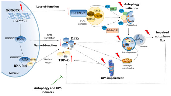 Chromosome 9 open reading frame 72 (C9ORF72) repeat expansions alter autophagy and the ubiquitin proteasome system (UPS) through a combination of loss- and gain-of-function mechanisms. Reduced C9ORF72 levels due to GGGGCC expansions may synergize with dipeptide repeat (DPR)-dependent gain of toxicity through autophagy and UPS deficits. In detail, C9ORF72 loss-of-function impairs autophagy initiation by hampering the recruitment of Rab1, Rab8/39, and ULK1 complex to the phagophore. At the same time, through a gain-of function mechanism, C9ORF72 repeat expansions lead to the formation of DPR proteins through a repeat-associated non-AUG (RAN) translation and/or through formation of RNA foci that sequester proteins such as TAR DNA-binding protein 43 (TDP-43) which are exported from the nucleus to the cytoplasm. This leads to the formation of cytosolic protein aggregates that alter mitochondria and impair the UPS while engulfing autophagy compartments. A failure in autophagy flux along with UPS catalytic activity eventually promotes further DPR protein and TDP-43 aggregation, which can be prevented by autophagy or UPS inducers. Flashlights indicate mutations or alterations.