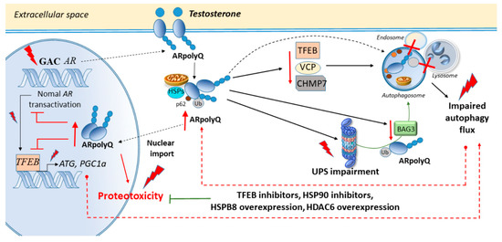 Androgen receptor (AR) repeat expansions produce proteotoxicity through autophagy and UPS impairment. A CAG expansion in the AR produces a long polyglutamine tract (polyQ) in the AR protein. The mutant AR (ARpolyQ) misfolds, and upon activation by the AR ligand testosterone, it forms cytoplasmic and toxic nuclear aggregates through a gain-of function mechanism. ARpolyQ occludes autophagy by decreasing transcription factor EB (TFEB), VCP, charged multivesicular body protein 7 (CHMP7), and also BAG3, which is activated as a compensatory response following UPS impairment by ARpolyQ. ARpolyQ nuclear accumulation may also lead to a loss of normal AR transactivation while further impairing autophagy. In fact, while normal AR promotes the activation of the autophagy inducer TFEB, ARpolyQ impairs both normal AR transactivation and TFEB-dependent autophagy, eventually promoting the accumulation of cytoplasmic ARpolyQ species which are imported in the nucleus to produce toxicity. Boosting ARpolyQ cytoplasmic clearance through autophagy and UPS inducers contributes to decreasing ARpolyQ nuclear accumulation and toxicity.