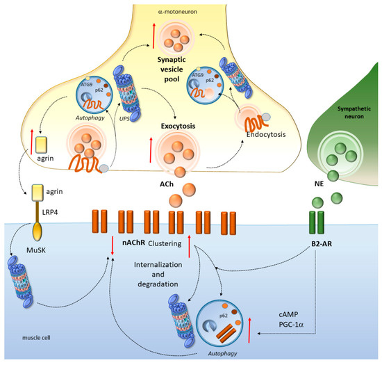 Besides the tuning of autophagy and of the agrin pathway, the beneficial effects of the sympathetic innervation of NMJs are being widely investigated in the treatment of muscle wasting disorders, including ALS and SBMA [45]. In detail, sympathetic neurons make close contacts with NMJs and they form a network involving blood vessels, motor neurons, and muscle fibers, which is crucial for synapse maintenance and function [165]. Direct stimulation of sympathetic neurons leads to activation of muscle postsynaptic β2-adrenoreceptor (B2-AR) and subsequent cAMP production, which is also key to control the abundance and distribution of AChRs in NMJs [165]. These events are molecularly associated with the import of the transcriptional coactivator peroxisome proliferator-activated receptor γ-coactivator 1α (PPARGC1A, or PGC-1α) into myonuclei [165]. Remarkably, PPARGC1A is known to upregulate autophagy through a SQSTM1-dependent mechanism [166]. In turn, the UPS mediates PPARGC1A nuclear degradation and governs its cellular localization, half-life, and potential biological actions [167]. These findings provide a potential mechanistic link between sympathetic innervation and cell-clearing systems in NMJ homeostasis. This is further supported by studies showing that trehalose, which has beneficial effects in both ALS and SBMA, induces autophagy in a TFEB-dependent manner through upregulation of PPARGC1A as well as well-known autophagy-related genes such as BECN1, LC3, ATG10, ATG12, and SQSTM1/p62 [101]. This is key since norepinephrine was shown to activate autophagy through B2-ARs [46,168,169], even though contradictory results have been provided documenting an activation of the mTOR pathway following chronic B2-AR administration, which is supposed to inhibit autophagy [170]. However, the fact that PPARGC1A activation similarly occurs following B2-AR stimulation and TFEB activation suggests that B2-ARs likely induce autophagy through mTOR-independent mechanisms, which calls for confirmatory studies. Altogether, these findings suggest that cell-clearing systems are key to grant NMJ homeostasis at baseline (Figure 4), while their alterations might promote NMJ derangements which occur early in ALS and SBMA.