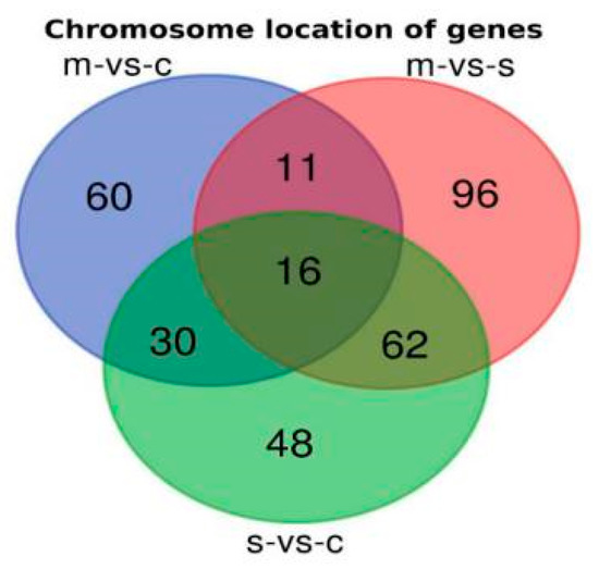 DEGs chromosomal location intersection between the three gene sets for moderate (m), severe (S), and moderate-to-severe asthma.