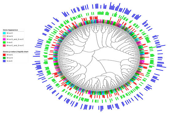Phylogenetic analysis of genes associated with moderate (M-vs-C), severe (S-vs-C) and moderate-to-severe (M-vs-S) asthma-related genes and intersected genes among these sets, where the p-values of these genes are shown (−log10).