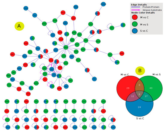 The PPI networks for DEGs differentiated in the three gene sets using Protein Interaction Network Analysis for Multiple Sets (PINA4MS). (A) PPI network, (B) the number of intersected genes through moderate (M-vs-C), severe (S-vs-C), and moderate-to-severe (M-vs-S) asthma gene sets. The color and shape of the edge (link) is related to the type of interaction (protein–protein or kinase-substrate interaction), where looped edges suggest that DEGs have a self-gene correlation. The color of the node of DEGs is associated with its participation in the asthma profiles studied.
