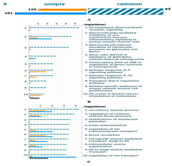 The number of genes recognized by this database was 163 for moderate asthma and 224 for severe asthma. Of these, 43 genes were common between the two phenotypes, 120 were unique to moderate asthma gene set and 181 were unique to the severe asthma gene set (Figure 6A). The top ten pathways that were enriched in both moderate and severe asthma gene sets are represented in Figure 6B. It seems that the most enriched pathway is the development glucocorticoid receptor signaling pathway; this pathway was enriched equally between the two gene sets. However, the glucocorticoid-mediated inhibition of proconstrictory and proinflammatory signaling in airway smooth muscle cell pathways has shown more enriched gene sets that belong to the severe phenotype (Figure 6B). I used a MetaCore analysis to study the GO biological processes of the gene sets for both the moderate and severe phenotypes. These GOs are involved in many biological processes, which are listed from 1–10 according to their significant association (Figure 6C). These processes are involved in the circulatory system process, regulation of systemic arterial blood pressure, and regulation of ion transmembrane transport.