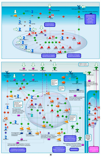 The most enriched pathway in both moderate and severe asthma is the development glucocorticoid receptor signaling pathway, which includes the upregulation of GCR, GCR alpha, and GCR beta (Figure 7A), and this is indicated with a full-red color thermometer labeled with “1” for the genes belonging to the moderate asthma phenotype and “2” for the severe asthma phenotype. The second enriched pathway is the glucocorticoids-mediated inhibition of proconstrictory and proinflammatory signaling in the airway smooth muscle cells pathway, in which the MRLC gene is involved in moderate asthma phenotype and the PLA2, p38 MAPK, and PA24A genes are involved in the pathogenesis of the severe asthma phenotype (Figure 7B).