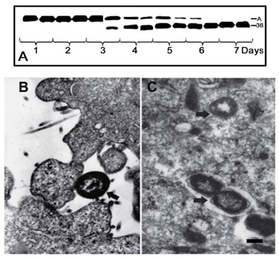Apathogenic Shigella flexneri 5a2c mutant treated with furazolidone can invade eukaryotic cells. (A) Detection of the actinase activity in the lysates of Shigella flexneri 5a2c acquired upon the furazolidone treatment. Numbers indicate the time points of bacteria growth when their extracts were tested for the actinase activity. A, actin; 36, the 36 kDa actin fragment. (B) Incubation of human larynx carcinoma Hep-2 cells with the furazolidone-treated non-pathogenic Shigella flexneri 2a 4115. (C) Invasion of the pathogenic furazolidon-treated Shigella flexneri 5a2c into human larynx carcinoma Hep-2 cells [39]. Arrows indicate extracellular bacterium (B) and intracellular bacteria lying in vacuoles (C). Scale bar, 0.5 µm. Reproduced from [45] with permission from Springer Nature License 4823180887079, 2020.